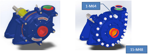 2.4更多數量、更大尺寸的泵蓋螺柱數量。 特別是在隔舍部位專門設置的螺柱,是這一系列渣漿泵的顯著特征。